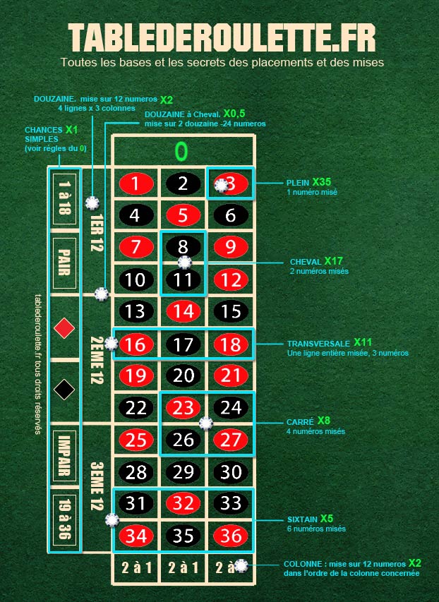 Nous détaillons ici toutes les options de mises de la roulette européenne en vous donnant des exemples de placements, les noms qui leur sont associés, mais aussi les montants payés par la banque. Avec ces explications et ce schéma, le jeu de la roulette ne devrait plus avoir de secrets pour vous. (notons que la roulette américaine propose quelques options de mises en plus mais nous n’entrerons pas dans leur détail).